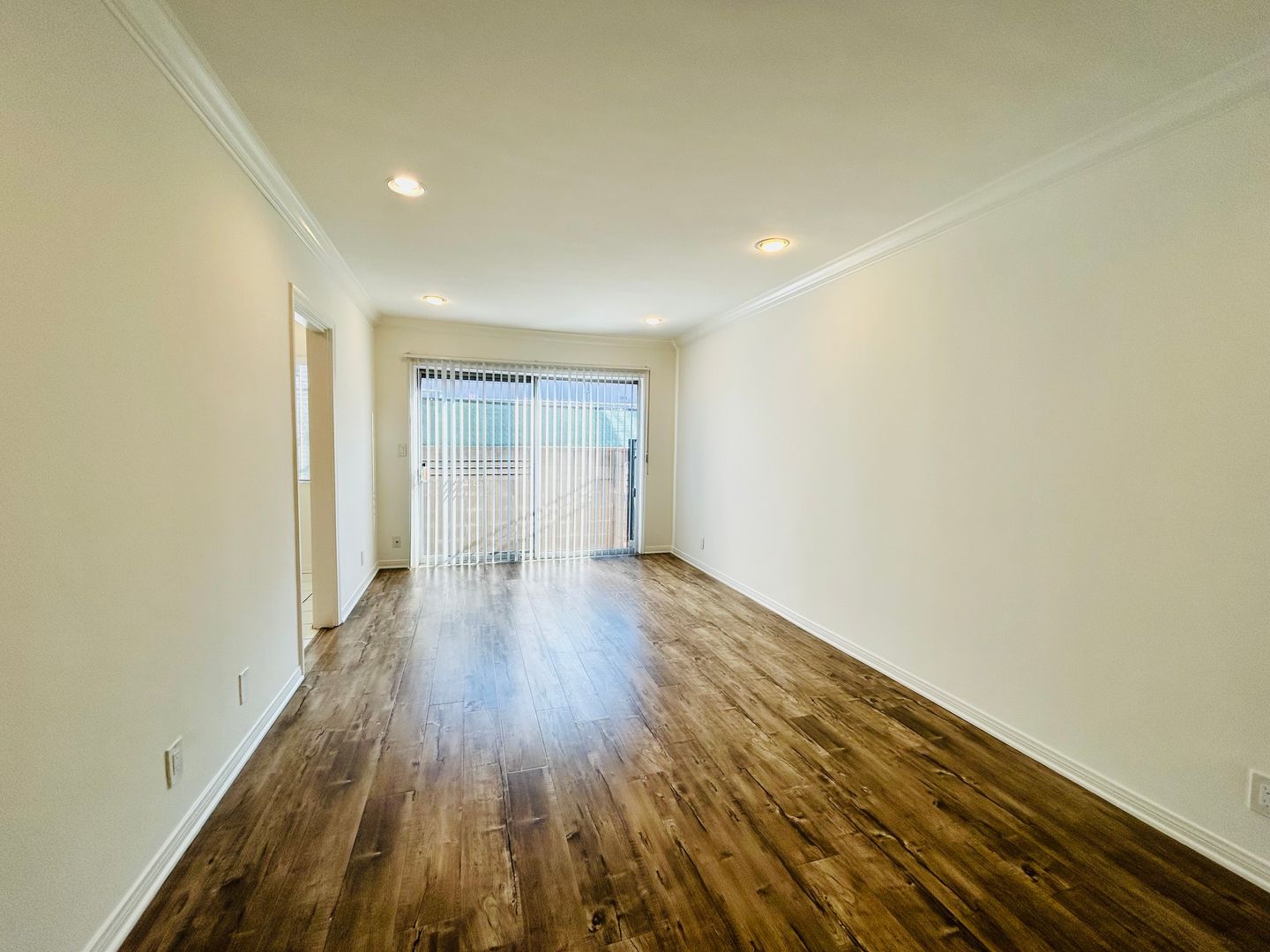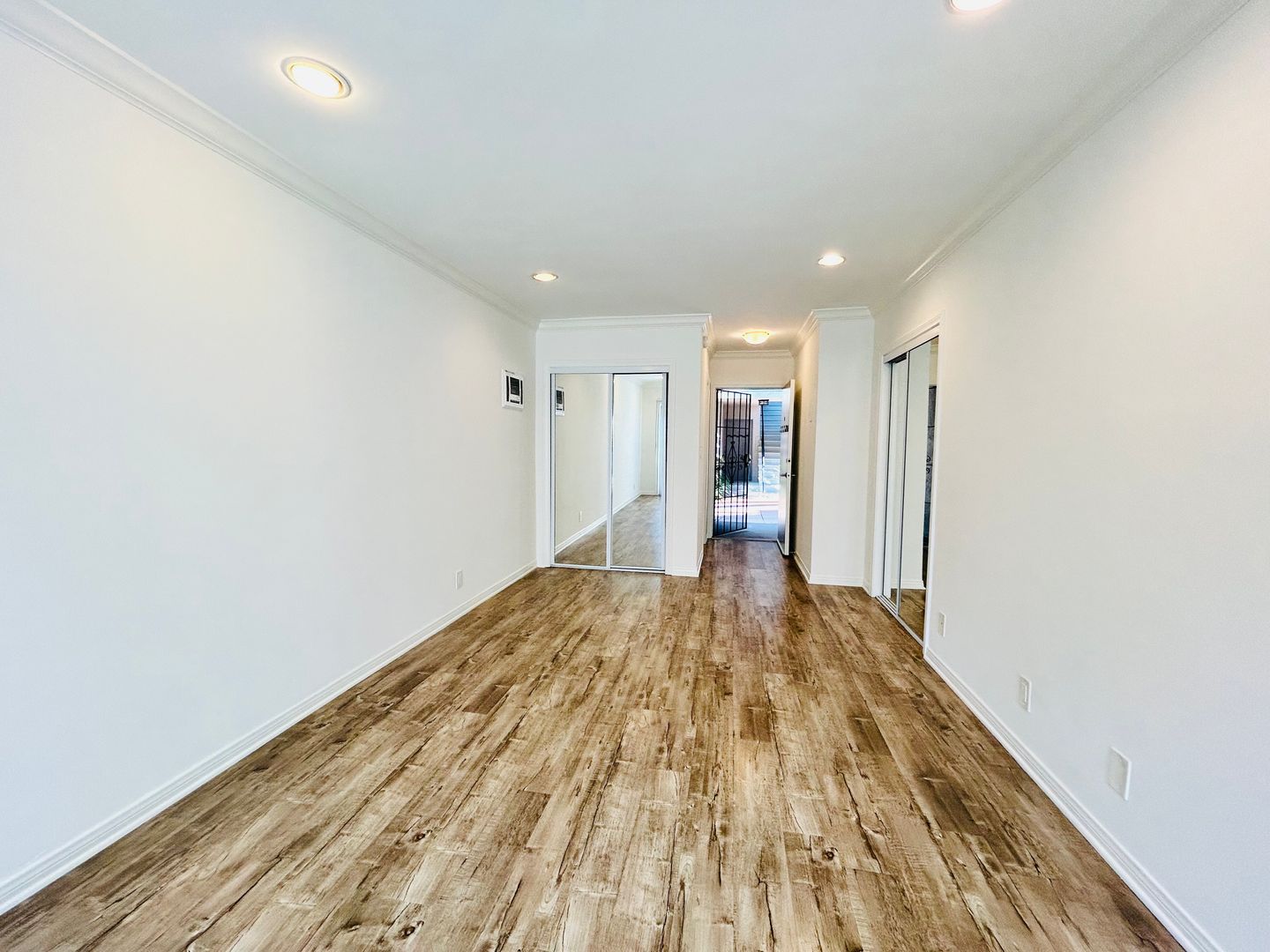 Located in the heart of West LA, this ground floor studio apartment features a fully equipped kitchen with white appliances, wall unit AC, wood-style laminate flooring, mirrored closet doors, recessed lighting, and a patio.