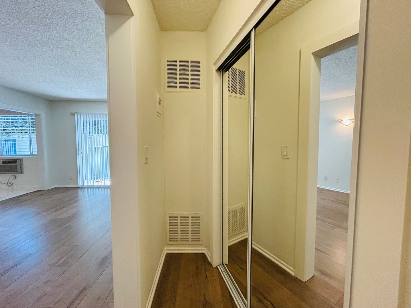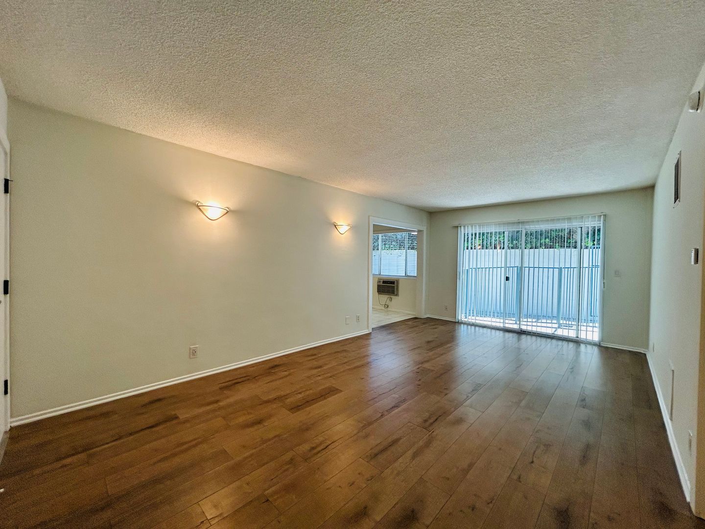This large studio apartment features a private patio, wood-style laminate flooring, air conditioning, stainless steel appliances including fridge, microwave, stove, and dishwasher. The apartment also comes with mirrored closet doors, a bathroom with a separate tub and shower, and ceiling fan.