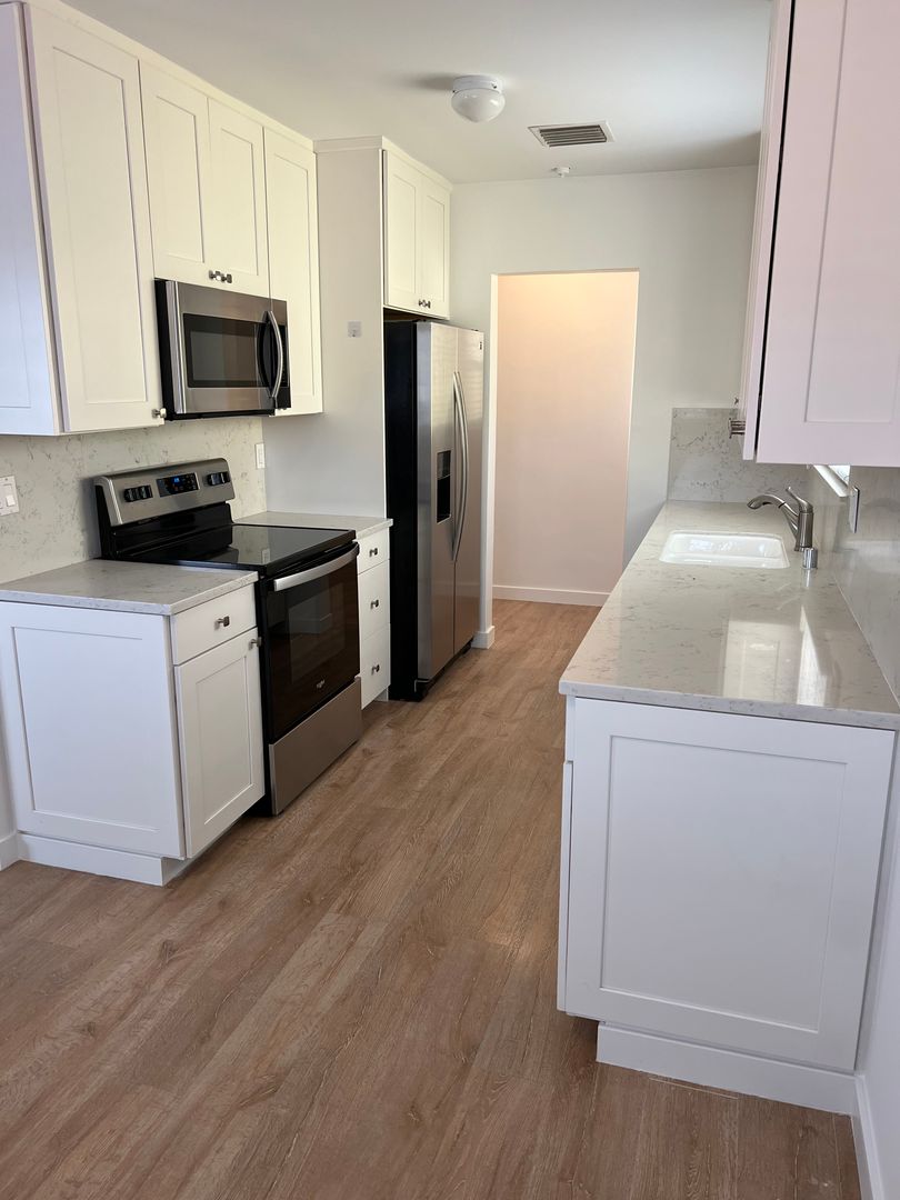 Step inside and be greeted by the exquisite wood-style laminate flooring that adds a touch of elegance to your living space. The stone counters in the kitchen offer both functionality and style, providing the perfect workspace for your culinary endeavors, along with stainless steel appliances.